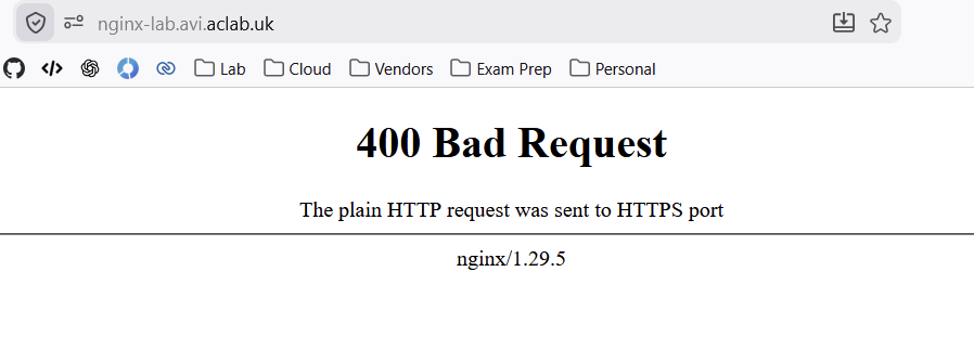 Unfortunately, AKO does not permit the use of BackendTLSPolicy objects, so the only possible route we have is the HTTPRule. When not configured properly, we get this error. This means that the HTTPRoute back end is doing an unencrypted connect to an encrypted port, i.e. the back end service is connecting to TLS 8443, which is not supported.
