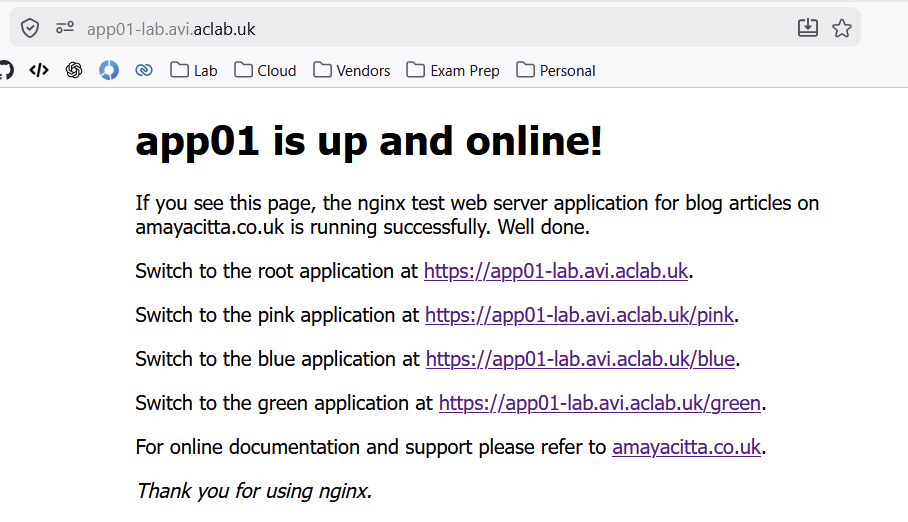 For this to work, AVI must have both “aclab.uk” and “avi.aclab.uk” domains attached to the AVI DNS profile. This is because we need the client HTTP header of the production URL to be accepted by the AVI virtual server, and the CNAME target address must also exist in the AVI DNS service.