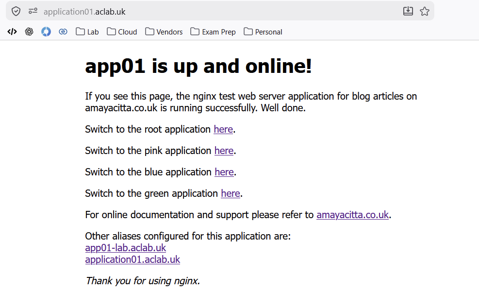 | CNAME | application01.aclab.uk | app01-lab.avi.aclab.uk. | Microsoft AD DNS | Deployed by External DNS by annotations on Ingress / Gateway / HTTPRoute objects. Production application FQDN that gets resolved by the AVI virtual server deployed with Ingress or HTTPRoute. |