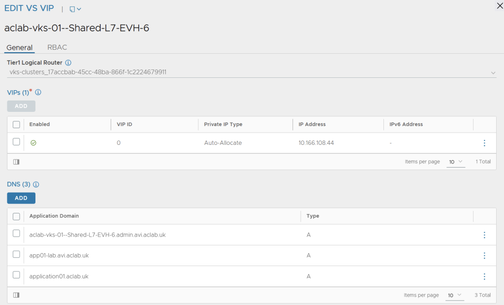 10.166.108.48 is the parent virtual server on the AVI with an application domain name “app01-lab.avi.aclab.uk” attached. Below shows the AVI VS VIP for the parent VS.