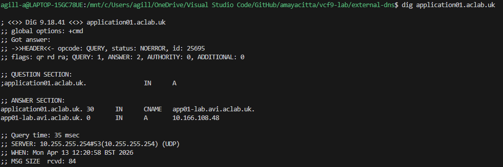 External DNS creates a CNAME for the production URL “application01.aclab.uk” with a target address of “app01-lab.avi.aclab.uk”. As this is within “avi.aclab.uk” the DNS request will be forwarded to the AVI DNS service.