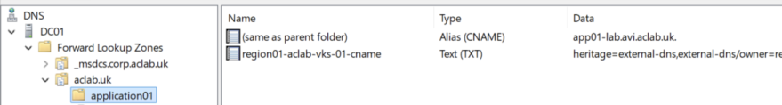 | TXT | region01-aclab-vks-01-cname.application01.aclab.uk | heritage=external-dns,external-dns/owner=region01-aclab-vks-01,external-dns/resource=httproute/dev/app01-aclab-nginx-httproute | Microsoft AD DNS | Deployed by External DNS. Infers external DNS ownership over the CNAME record. |