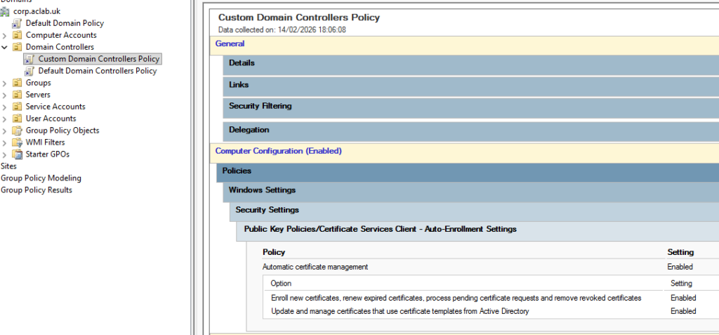 | subca02.corp.aclab.uk | Issuing Subordinate Server 02 | pki.corp.aclab.uk – Web Enrollment crt.corp.aclab.uk – AIA HTTP Path crl.corp.aclab.uk – CDP HTTP Path |