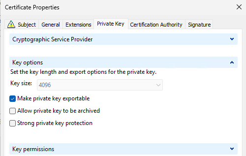 If you only plan to use the certificate on the system you are issuing the cert to, unselect make private key exportable. This helps protect it as it can’t be reused anywhere else.
