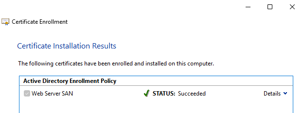 Investigating the certificate, it should come from the local AD site, which just happens to be itself in this lab example. If this were a server or a client, it would try to use the CA server in the local AD site.