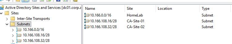 In the lab, each of the Sub CA servers is deployed into a specific AD site, which will allow us to configure site awareness. To achieve this, the following site arrangement is configured: the sites are very specific /28 networks within VMware NSX VPC subnets. The names are functionally labelled for the lab and wouldn’t reflect what would usually be present in production. Normally, AD sites represent geography and domain controllers are present to handle authentication requests to specific sites; CA servers would follow the same boundaries.