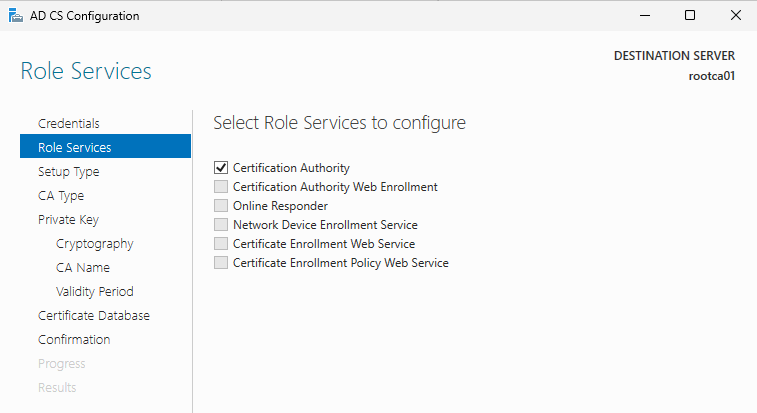 To deploy the roles, the following commands were run. Before doing this double-check that the CAPolicy.inf is in place in C:\Windows.
