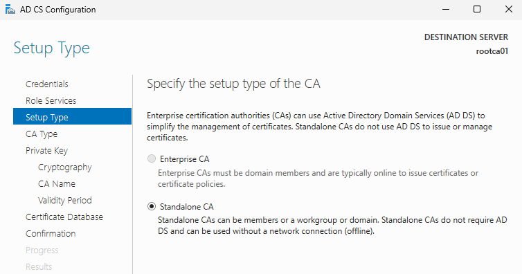 For reasons of better security, the Root CA is usually not domain-joined, it is “standalone” and is turned off most of the time, unless there is some maintenance to perform. Being offline most of the time helps protect the private key, which is used to generate certificates. A thing to note is that if you obtained a copy of said private key, you could generate infinite certificates impersonating the organisation that owns the CA. If you think that through, this means you could pretend to be the owner, manipulating the chain of trust, which is a springboard to further vulnerability, breaking open what is otherwise a mechanism to keep a business’s data encrypted and safe.
