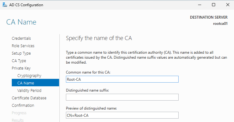 For security, don’t use the hostname in the CA name; use something simple that masks the true name of the server. Here is a straightforward generic example.