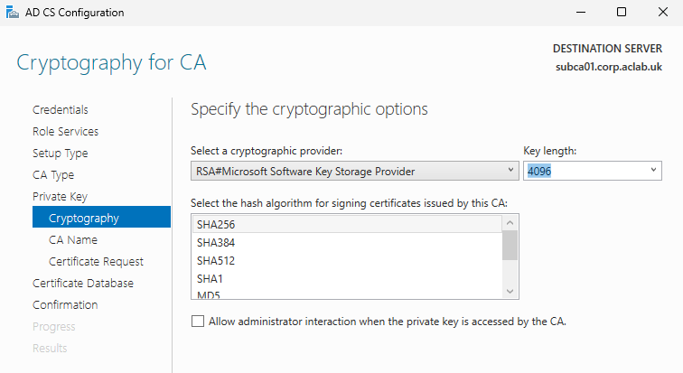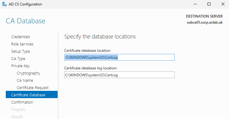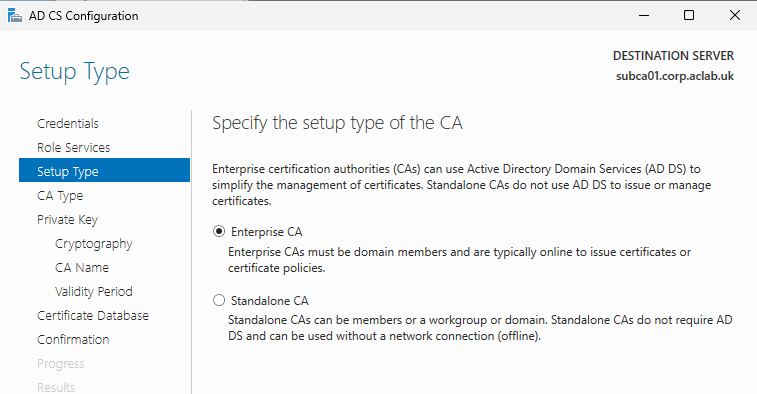 | subca01.corp.aclab.uk | Issuing Subordinate Server 01 | pki.corp.aclab.uk – Web Enrollment crt.corp.aclab.uk – AIA HTTP Path crl.corp.aclab.uk – CDP HTTP Path |