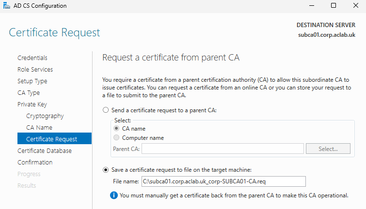 Load Server Manager and complete the CA setup on both subordinates. Below are the values used for the one; the other one follows the same, but changes the naming.