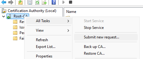 From the Root CA console, right-click> All Tasks > Submit new request. Browse to C:\Temp and select the req file.