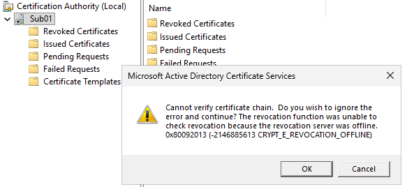 Ignore the revocation error for now; this just means the CRL is not available on HTTP yet. Had we also included LDAP, this would not have occurred. We are using HTTP only as it’s best for client compatibility.