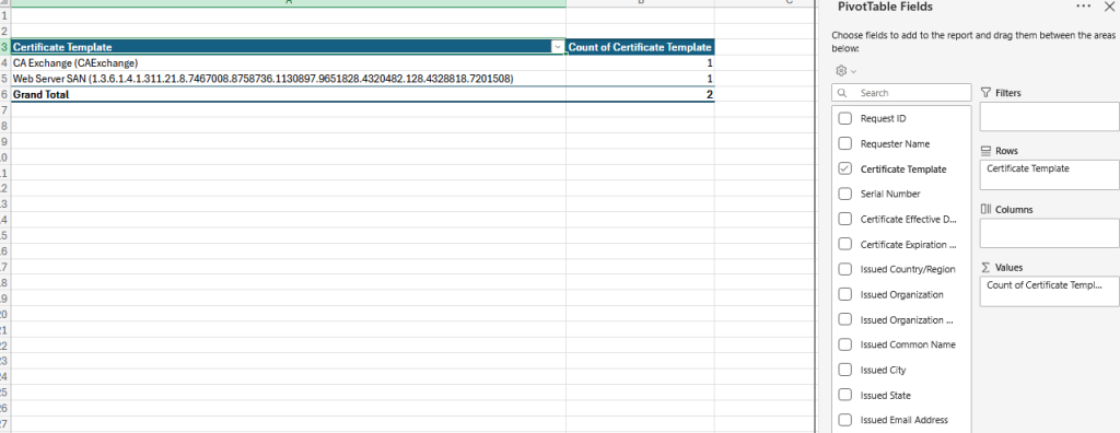 At this point we can open in Excel and manipulate, filtering out expired certificates and creating the pivot table for an easy evaluation of template usage.