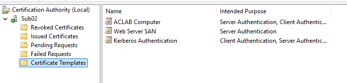 First thing to understand is what CA template is used, in our example we have an “ACLAB Computer” template being issued to all clients using automatic certificate enrollment using site awareness across both subordinates.
