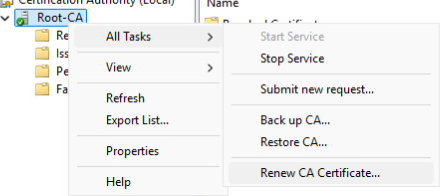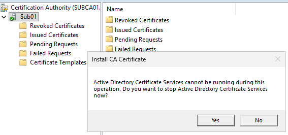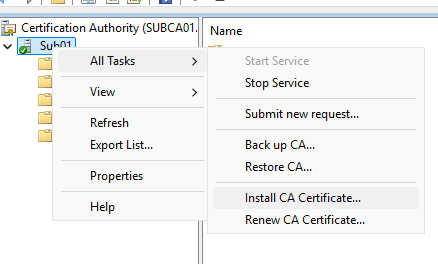 Copy the file over to the SubCA itself. From the standard certificate services console right click > all tasks > install CA certificate > select the file we copied. This will pair the private key which was generated by the renew CA certificate option with the issued public key.
