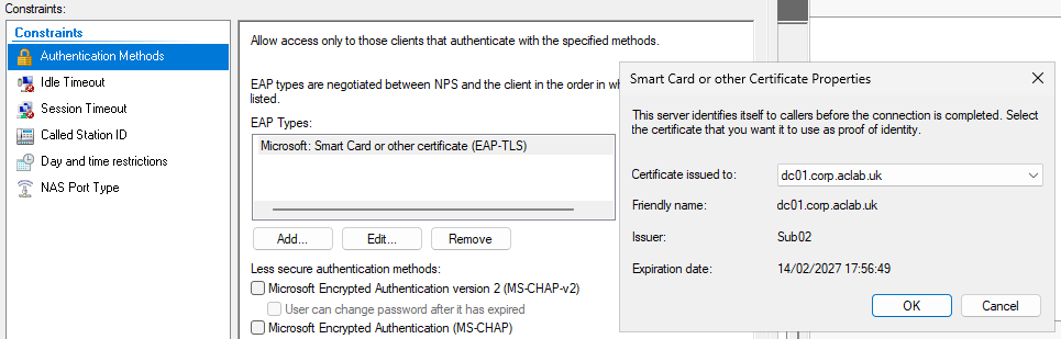 - Within the NPS server the EAP-TLS policy will also be attached to a certificate which is issued from the old root. This will also need updating, only do this once all clients have the new root and the updated wireless GPO.