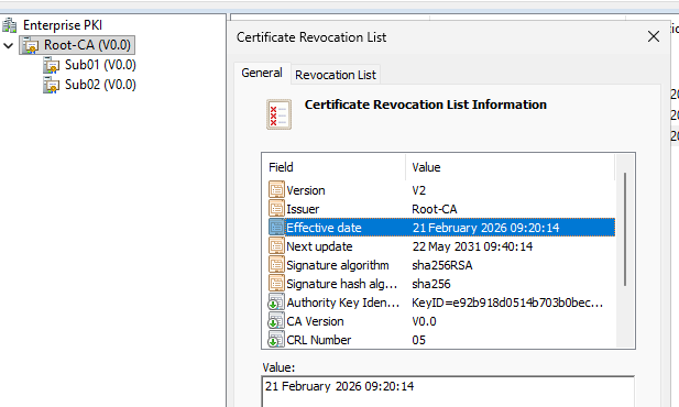 If you properties on the Root CA, you will see a new certificate with a new hash number. You can view this and confirm all looks good, check the valid from field.