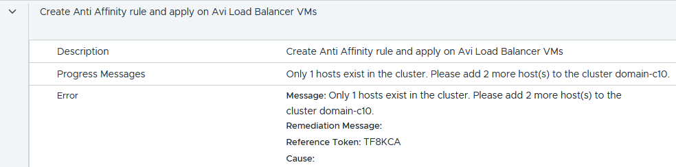 If you have a single host, hopefully you didn’t get this far and have already completed the single-node deployment as outlined below. If needed, go to the workload domain > actions > remove AVI load balancer and then complete the steps in the single node control plane section below.
