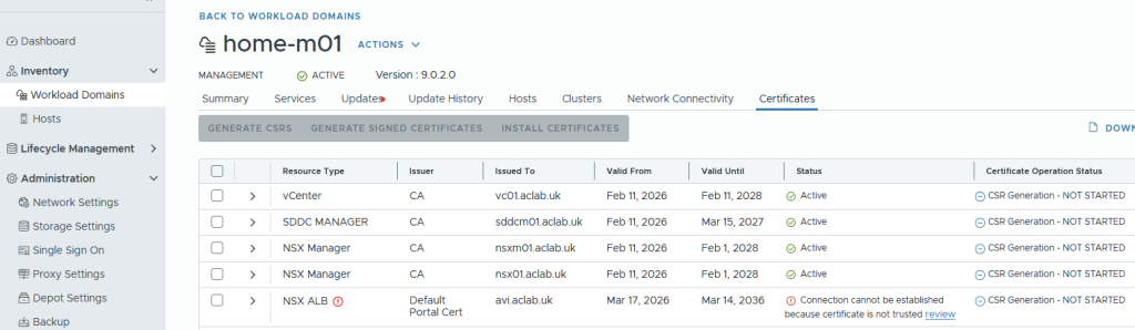 Within the workload domain services, there is no AVI, and there is no fix I know of.