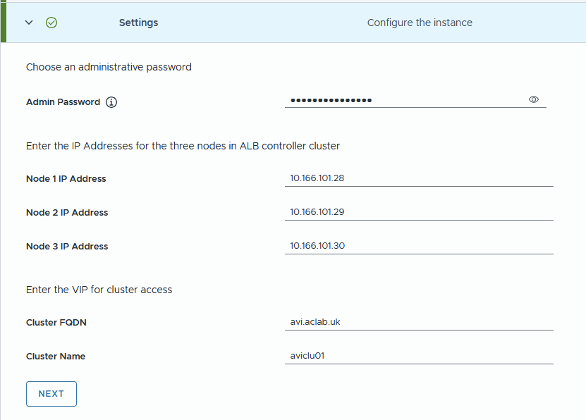 Complete the details referencing the DNS records added earlier. DNS resolution of the AVI FQDN is what determines the VIP address. Click next.