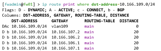 As it’s public, the subnet is exposed to the external network via the VPC gateway > Transit Gateway and Tier-0 Gateway. The route table on my MikroTik router has paths to each of the external IP’s on each NSX edge in the Tier-0 edge cluster. The passive edge will prepend its AS three times, so only the active edge will be used for routing.
