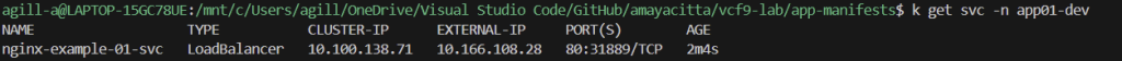 A better route would be to set up Gateway API or Ingress, which will also attach to a load balancer, but at Layer 7. I will say more on this later; for now, we can run the below to connect at L4 via NSX.