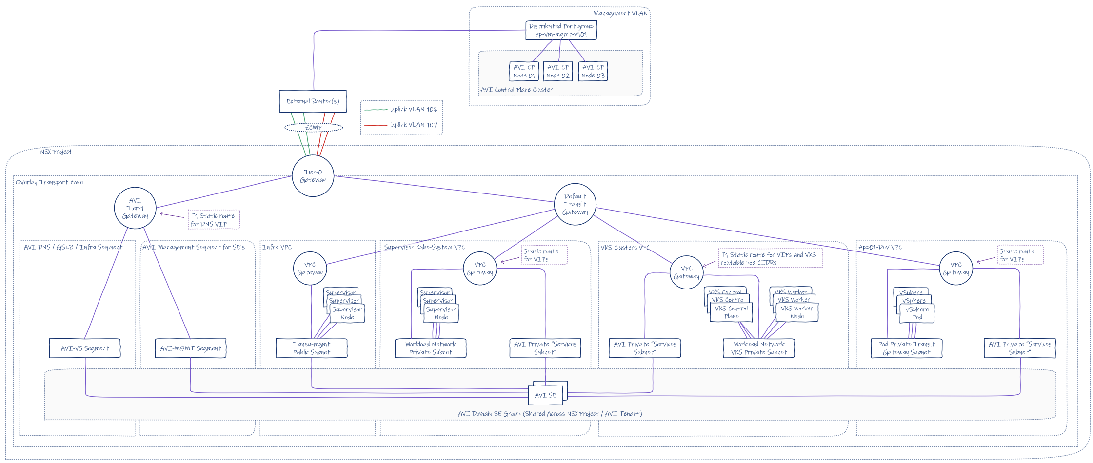 - Deploy a dedicated NSX manager and AVI control plane cluster into each workload domain. This is referred to as a 1:1 architecture.