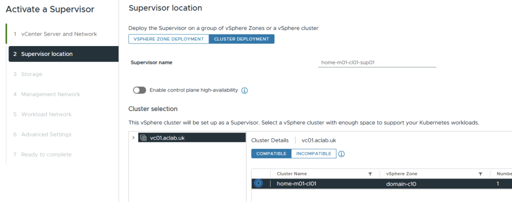Select the cluster deployment and the cluster to deploy to. If you happen to have multiple zones, you can stretch the supervisor nodes across them by doing a zonal deployment. In the lab, I’m only deploying a single supervisor node, hence the control plane HA box is not enabled.