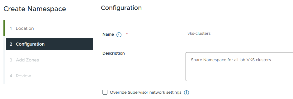 Next, we need to create a namespace as a home for the VKS clusters. You can create multiple of these and give granular permissions to each, or, for example, have a single shared one. In my lab, I just have a shared “vks-clusters” namespace, to which all VKS clusters reside.