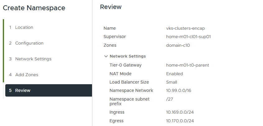 The namespace subnet prefix is the default allocated CIDR size for each namespace deployed. It determines how many vSphere pods you can deploy; each one will consume a single address. I tend to prefer VKS cluster workloads, so I will leave this at a default /28