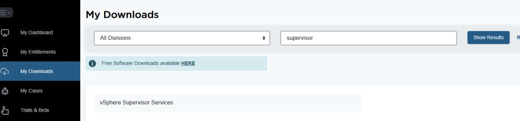 At this point, we want to upgrade the VKS supervisor service and also install the local consumption interface. To do this, we need to log in to the Broadcom portal. Click My Downloads, then search for supervisor. Click vSphere supervisor services.