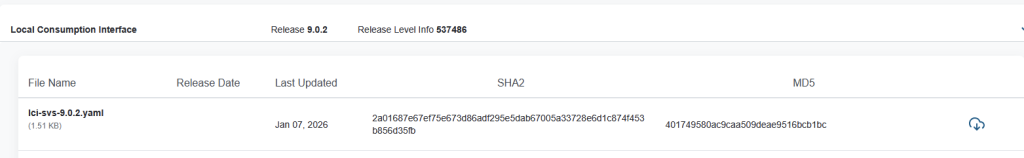 Download the YAML file for vSphere Kubernetes Service and Local Consumption Interface. I’m running 9.0.2, so I can download the latest. If you’re not sure, check the interop matrix and also the supervisor services GitHub page. Between those two, you can figure out compatibility.