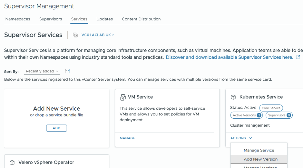 Once you have the YAML files, from supervisor management > services > select actions on Kubernetes Service and add a new version.